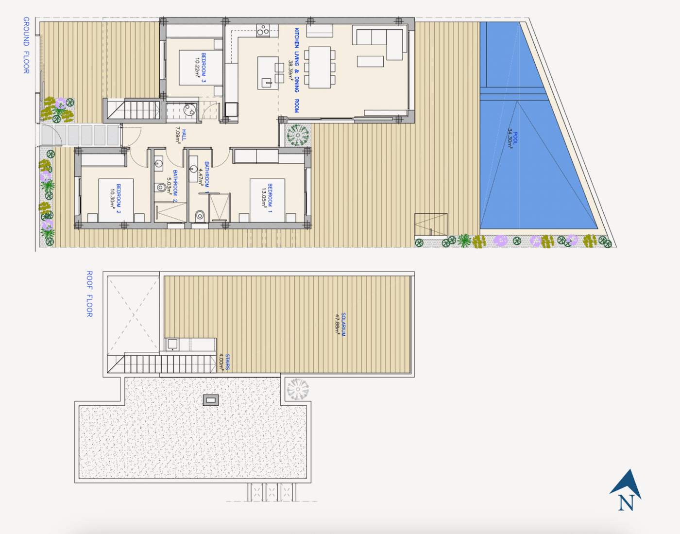 - Private outdoor space: Enjoy a private swimming pool, large terraces, and an optional 48m² rooftop terrace, perfect for relaxing, entertaining, or simply enjoying the views. Includes a private parking space on the plot.