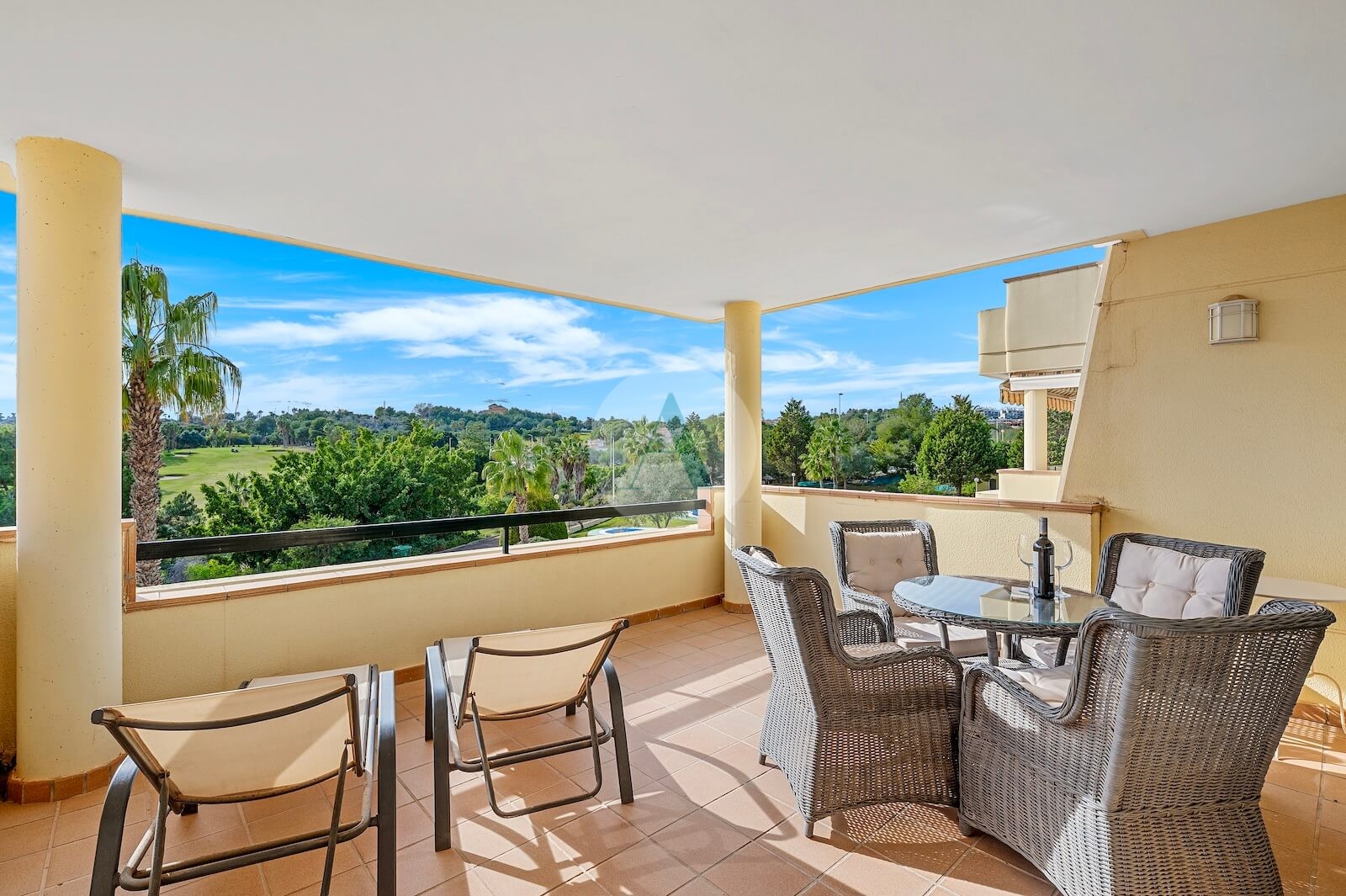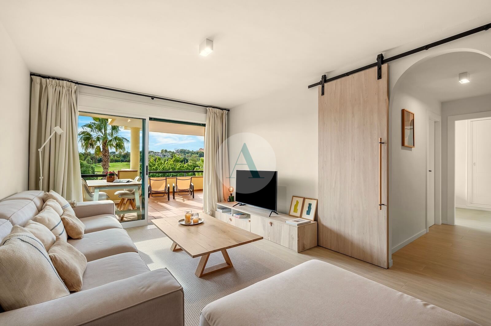 From the sunny terrace, you enjoy open views over the golf course, the surrounding greenery and the communal swimming pool. Inside, the apartment offers a calm and comfortable atmosphere, with the golf landscape always present in the background.