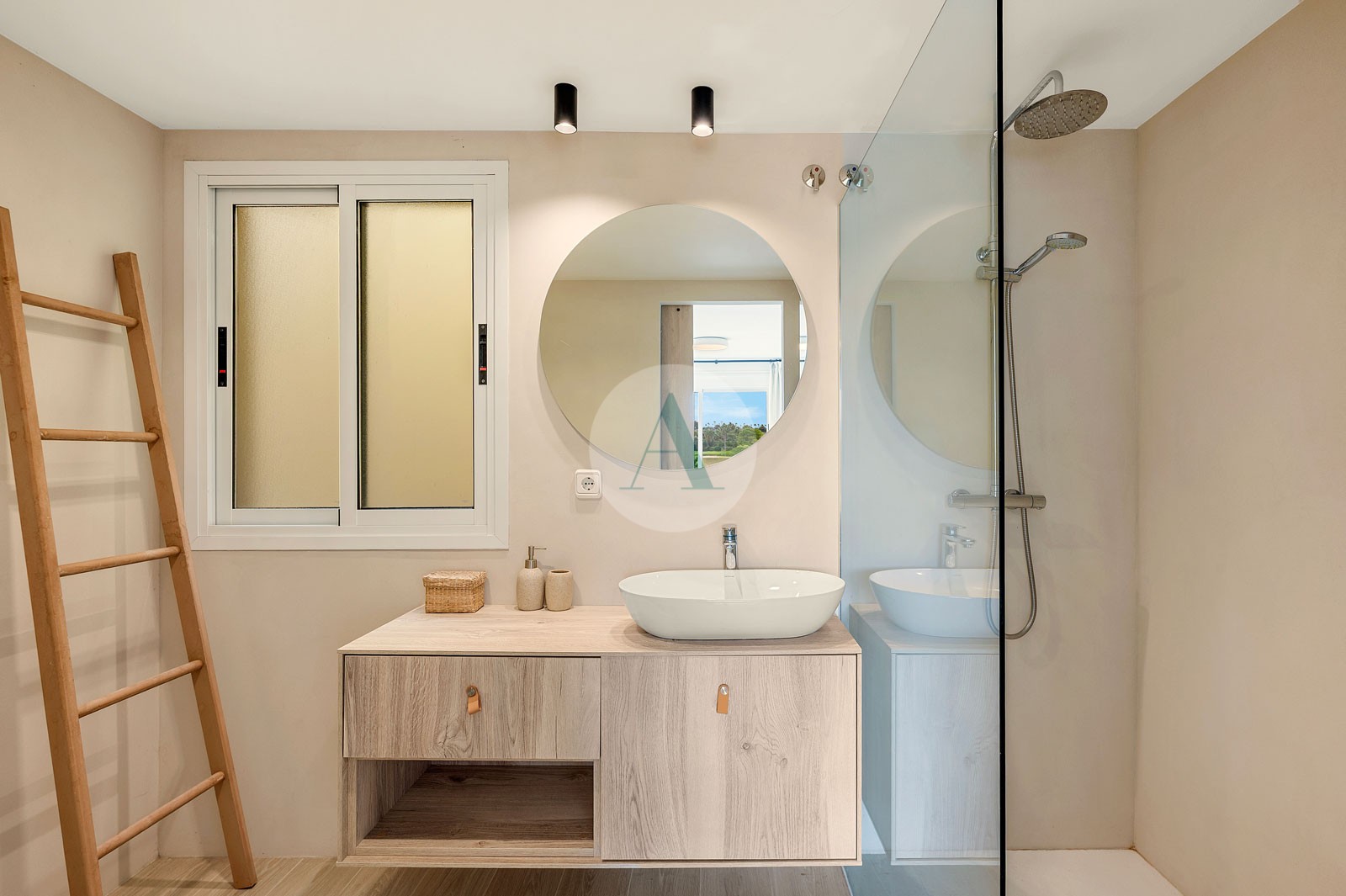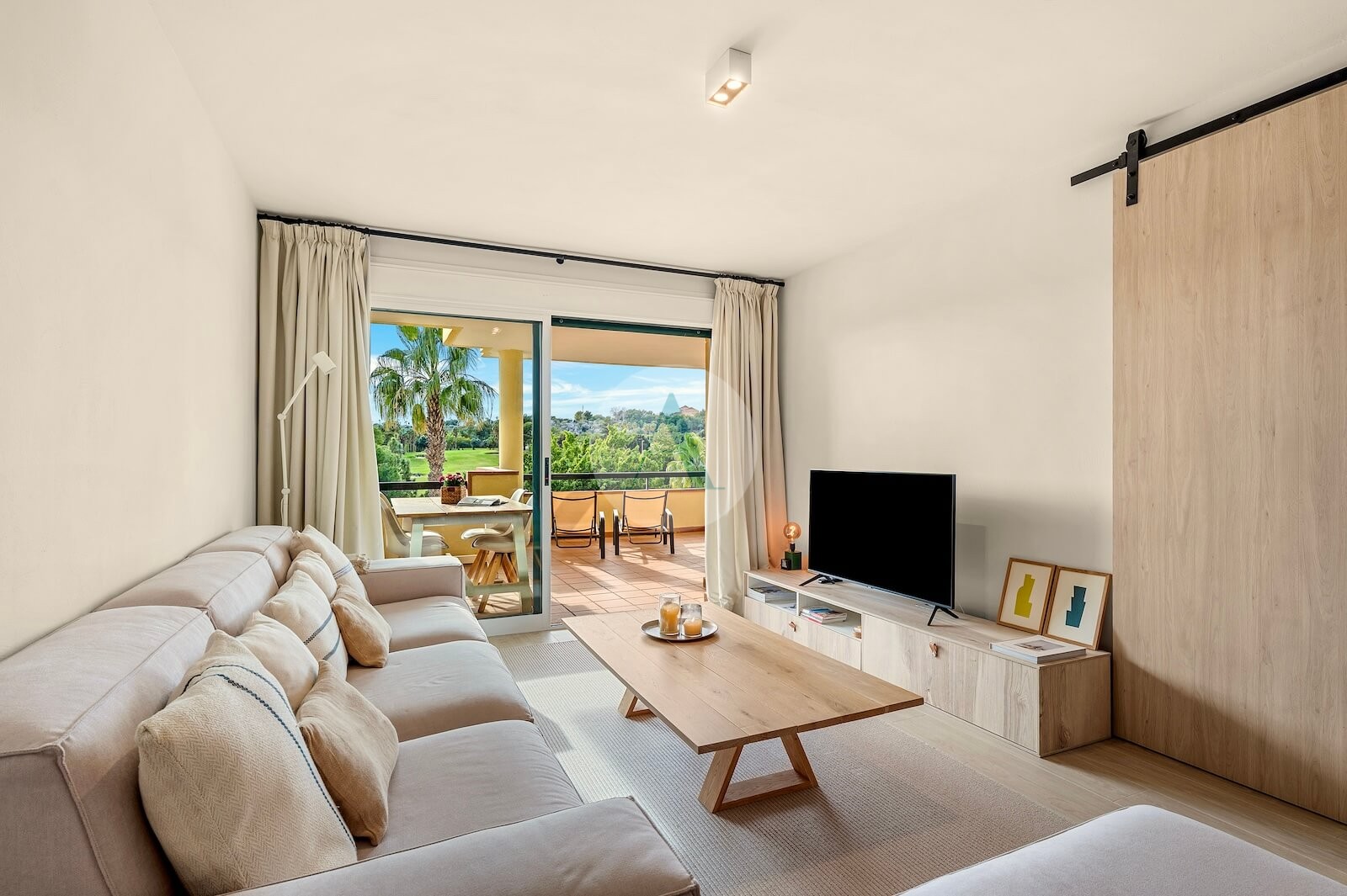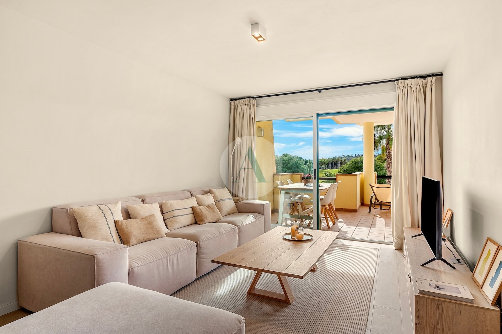 - Timeless interior design with neutral Mediterranean tones, light wood finishes, linen textures and artisanal details