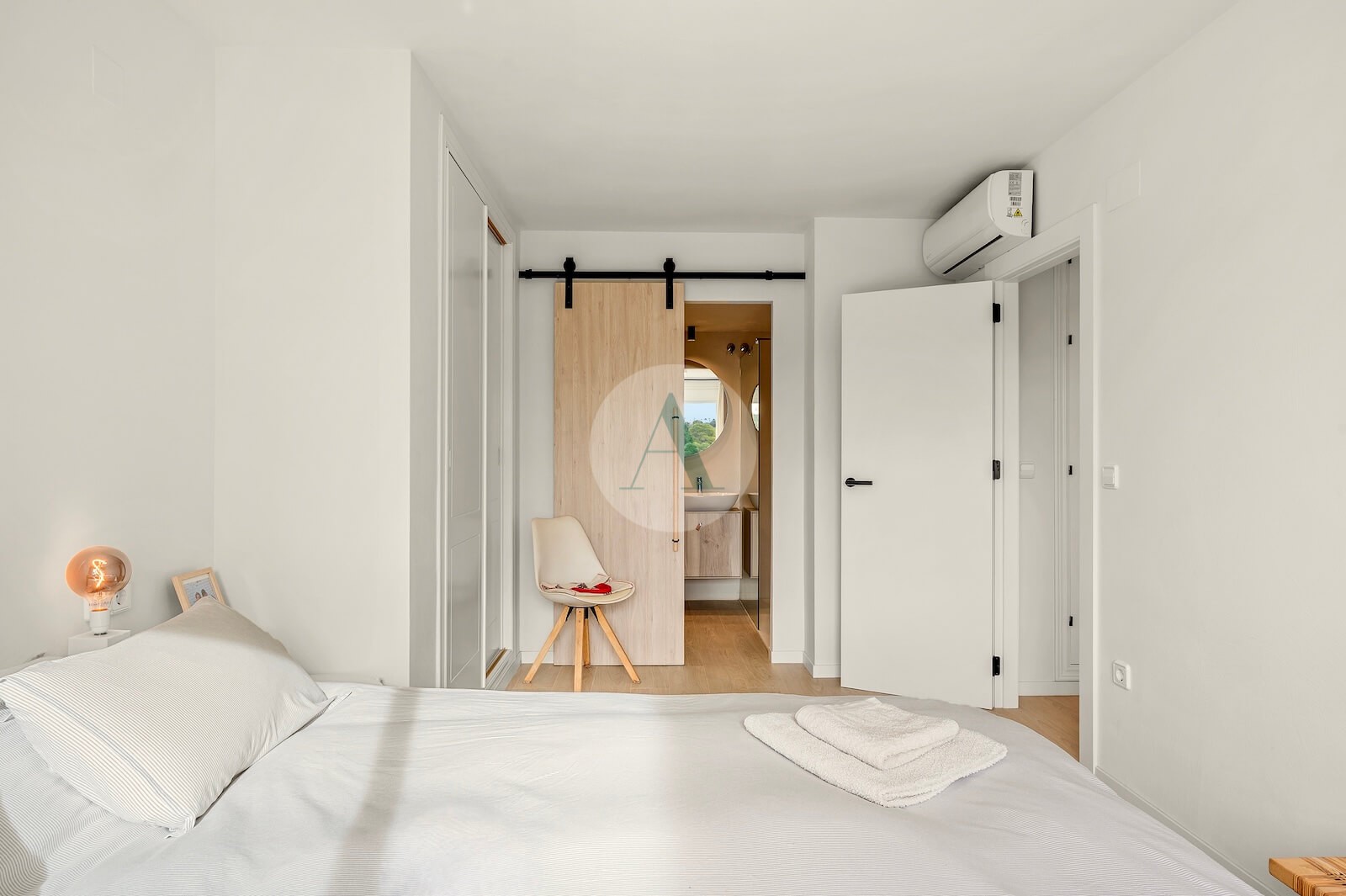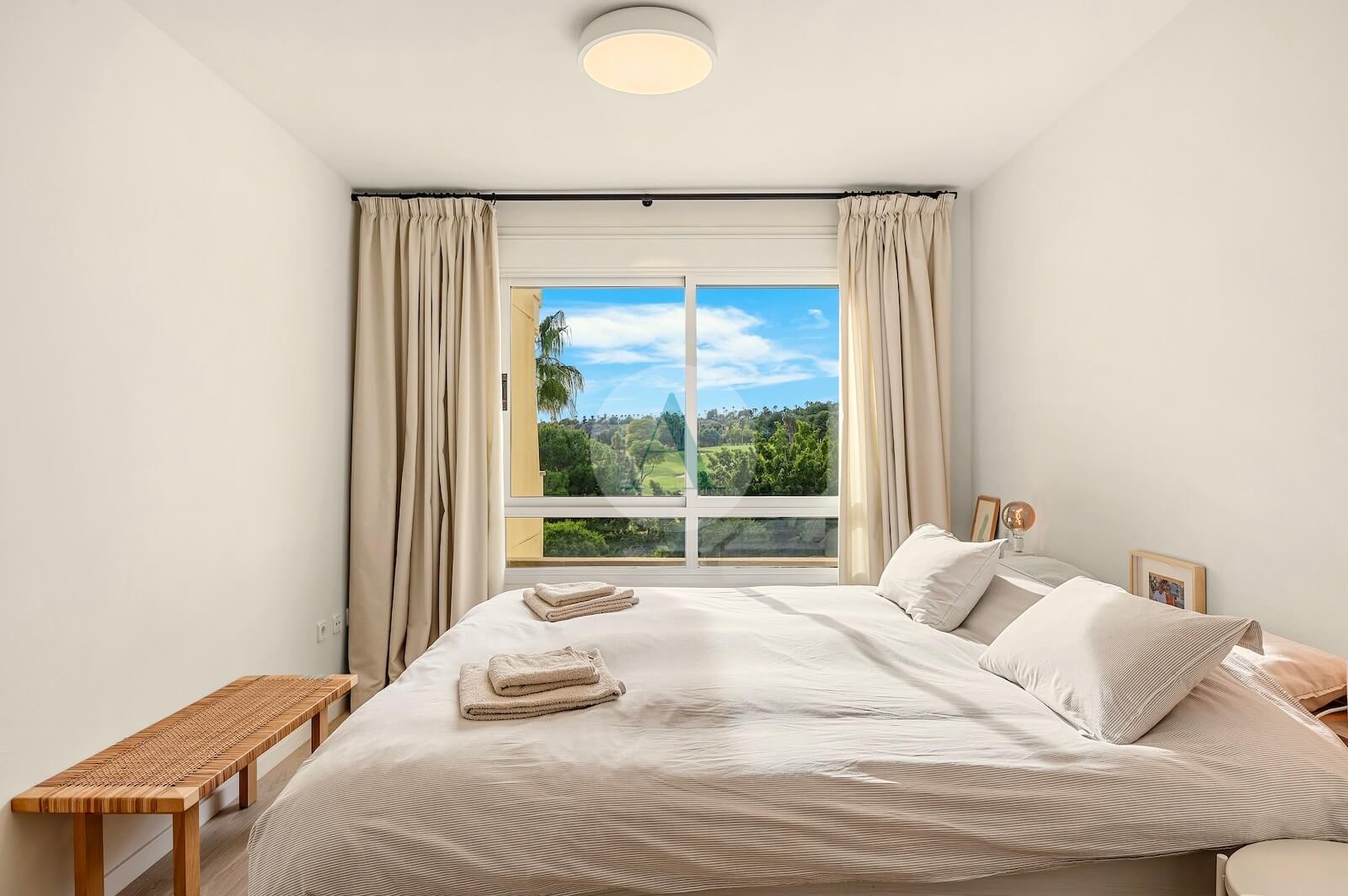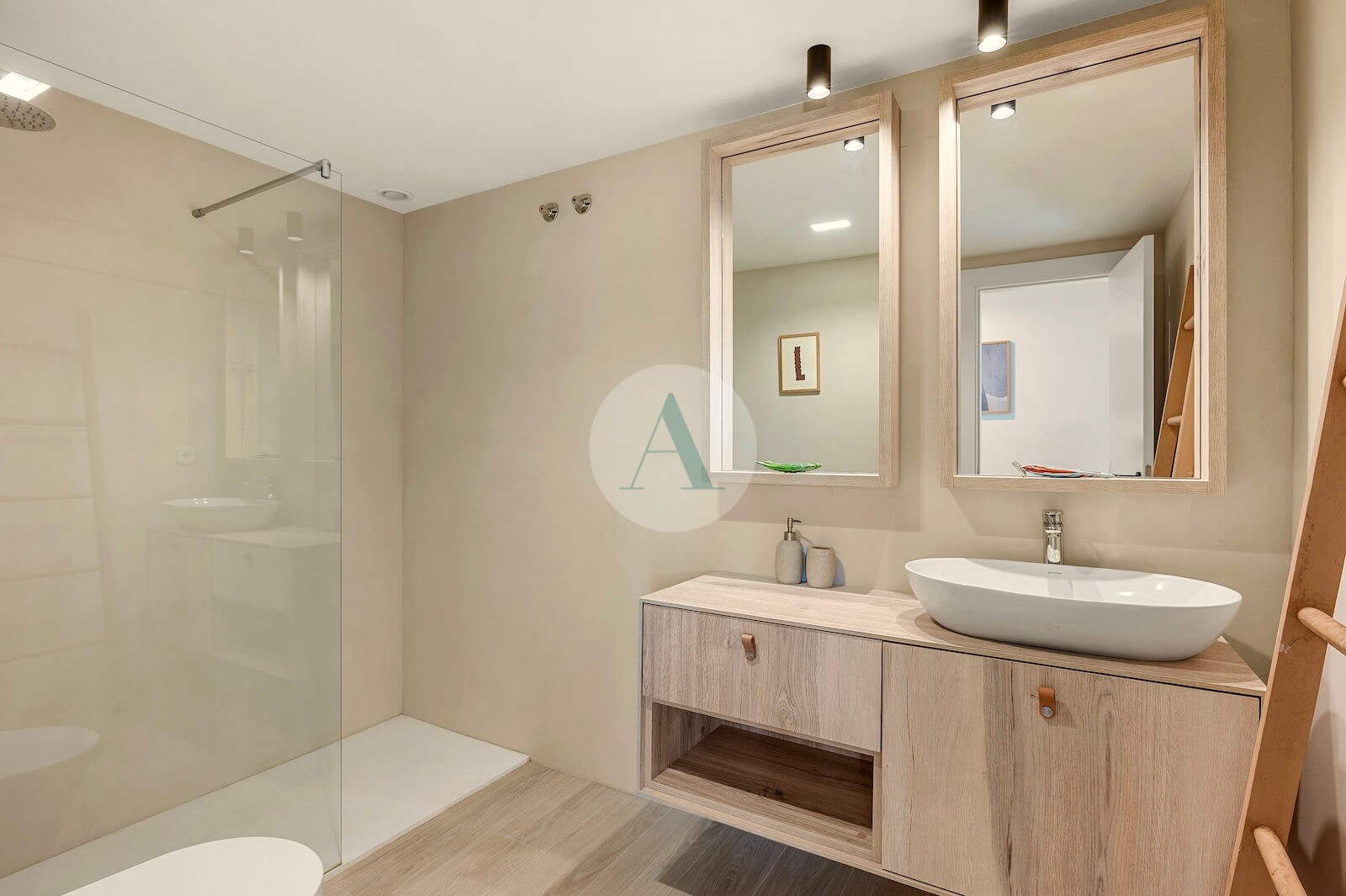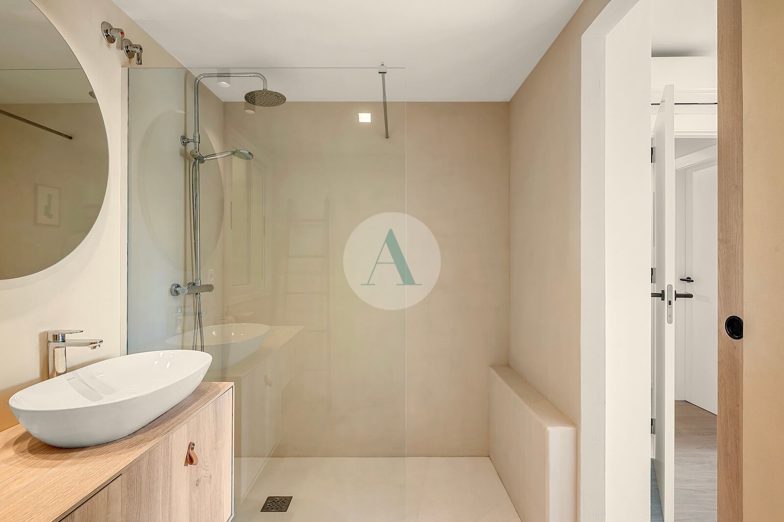 - Timeless interior design with neutral Mediterranean tones, light wood finishes, linen textures and artisanal details