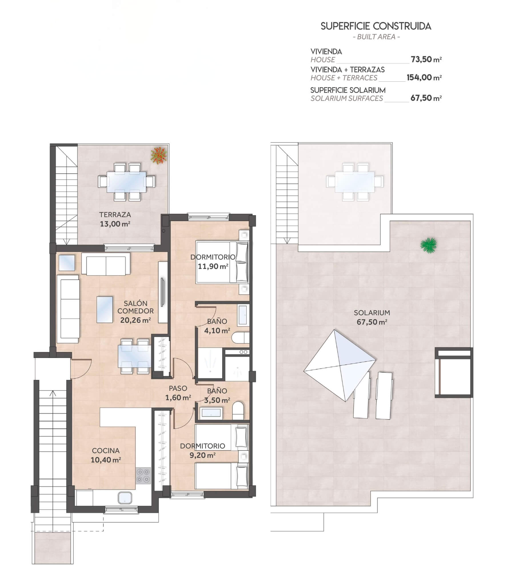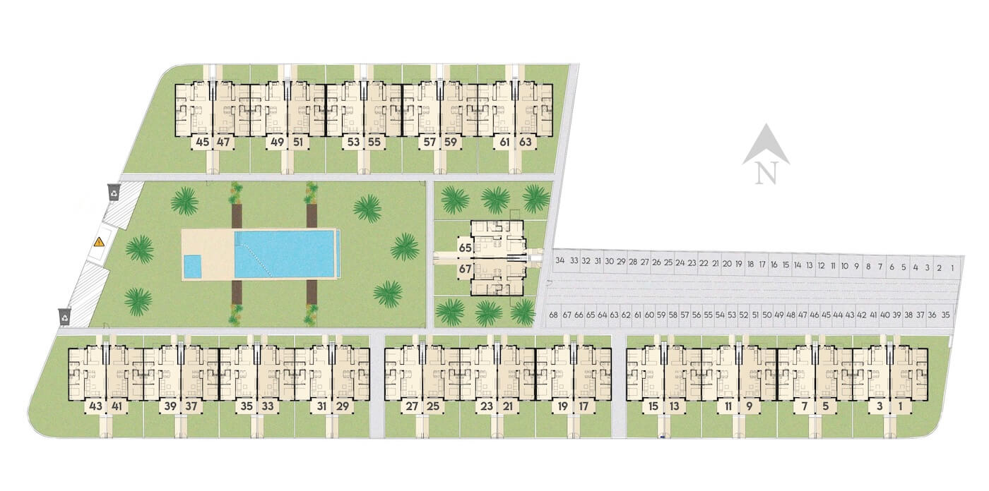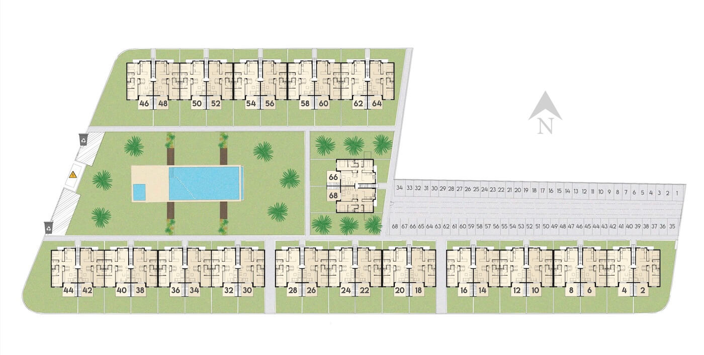 - Top floor homes: Designed with 2 bedrooms, 2 bathrooms, a large private solarium, parking, and some sea views.